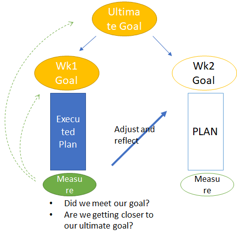 “Well, we have 6-months, so if we lose 1-kg every month.. “, said a lady from strategy / planning function. I can see where she comes from, and it sounds very logical breakdown of goals. “Excellent! Now we have a target for every month. ‘Drop 1-kg every month'”. I noted that on the whiteboard as well. “So, what should I do if after 1-month I didn’t drop 1-kg?”, a probing question on options. “Add sport!”, a gentleman who has been sitting quietly suddenly gave an idea. “What a wonderful suggestion!”, I jotted down the idea.
